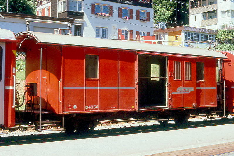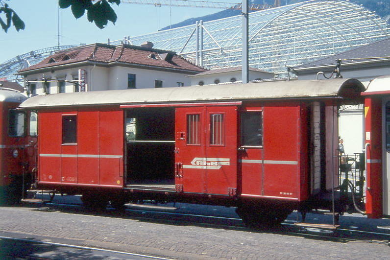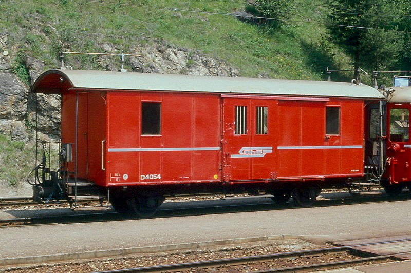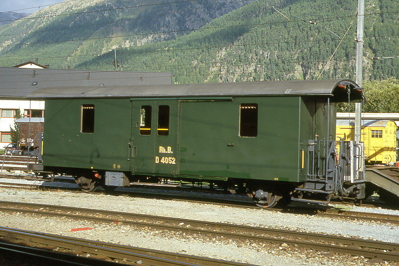 RhB - DZ² 4037 II - Gepäckwagen mit Postabteil am 31.08.1993 in St.Moritz - Baujahr 1911 - SWS - Fahrzeuggewicht 9,00t - Zuladung 10,00t - LüP 10,69m - zulässige Geschwindigkeit 65 km/h.- ®2=24.06.1992 - RhB-Logo italienisch - Lebenslauf: ex F 4038 - 1964 D² 4038 - 1986 DZ² 4037II - 02/2004 Abbruch