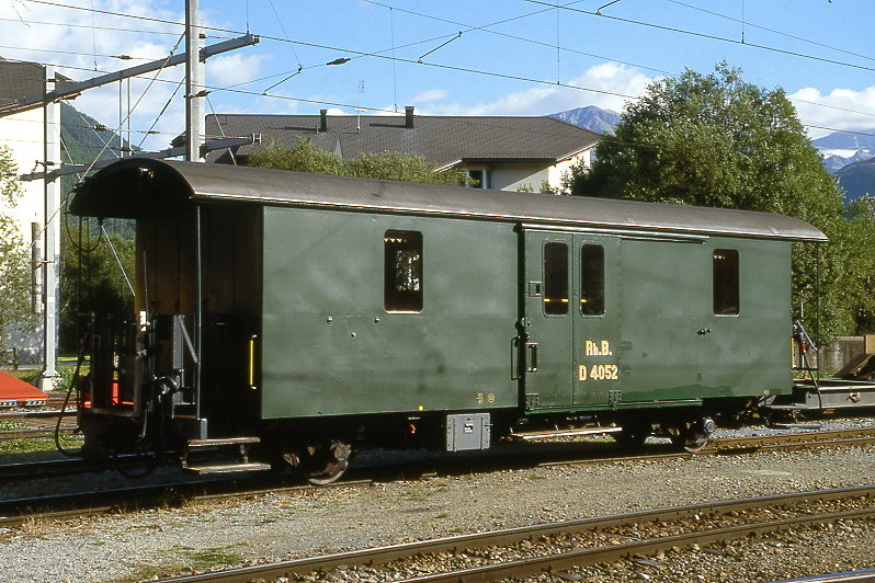 RhB - D² 4054 - Gepäckwagen am 11.08.1992 in Chur - Baujahr 1897 - SIG/RhB - Fahrzeuggewicht 8,00t - Zuladung 10,00t - LüP 9,54m - zulässige Geschwindigkeit 60 km/h.- ®2=30.03.1987 - RhB-Logo - Lebenslauf: ex AB 20 - 1899 AB 110 - 1926a - 1928 Umbau zu F 4054 - 1964 D² 4054 - 02/1999 versetzt ins Misox - 12/03 an SEFT D² 12